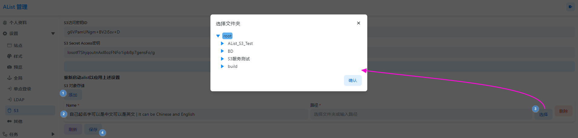 左侧是对外显示的存储桶名字,右侧是OpenList已有的列表目录路径,如果想将整个根目录全部映射出去可以可以选择列表中的