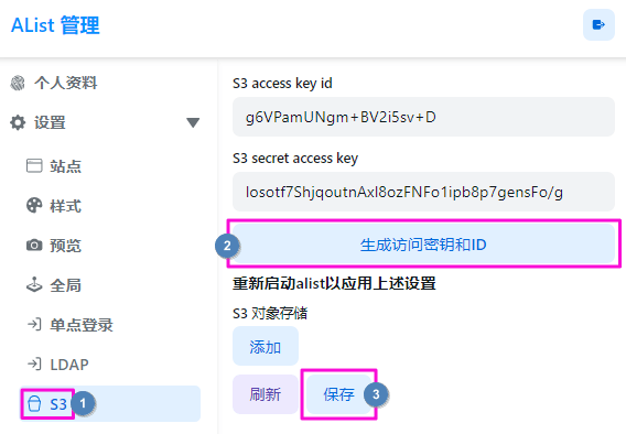 - 如果你后续更新访问ID和秘钥,更新保存,再重启OpenList才可以生效